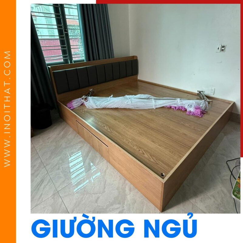 Giường Ngủ chất liệu gỗ sáng, đầu giường bọc nệm tại phường Long Biên